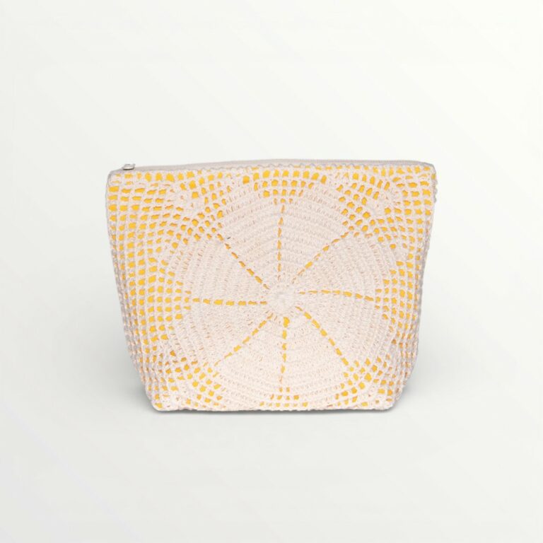 Trousse format cube en tricot. Un accessoire doux et original pour ranger vos essentiels beauté.